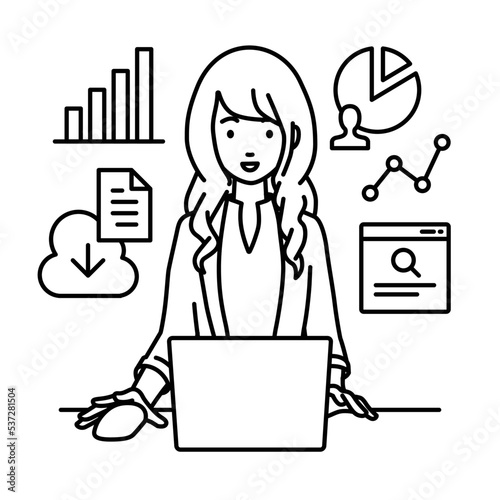 デスクでPCを前にリサーチ・データ分析・レポート作成をしているジャケットの女性