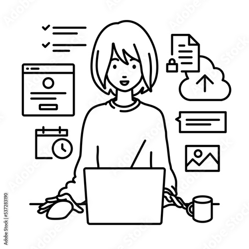 デスクで座ってPCでプロジェクトやタスクの管理の仕事をしているリモートワークの女性