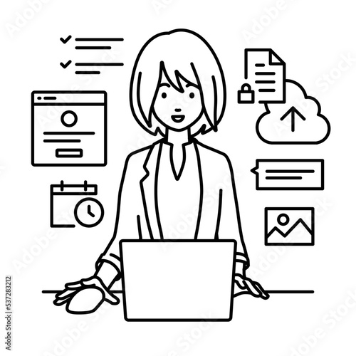 デスクで座ってPCでプロジェクトやタスクの管理の仕事をしているジャケットの女性