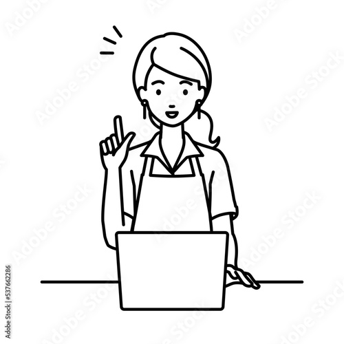 デスクで座ってPCを開いて何かひらめいた店員の女性