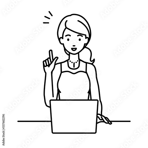 デスクで座ってPCを開いて何かひらめいたドレスの女性