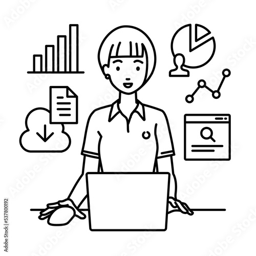 デスクでPCを前にリサーチ・データ分析・レポート作成をしているポロシャツの女性