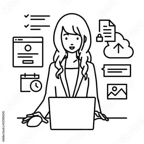デスクで座ってPCでプロジェクトやタスクの管理の仕事をしているスーツの女性
