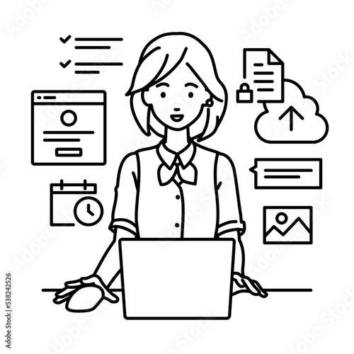 デスクで座ってPCでプロジェクトやタスクの管理の仕事をしている事務員制服の女性