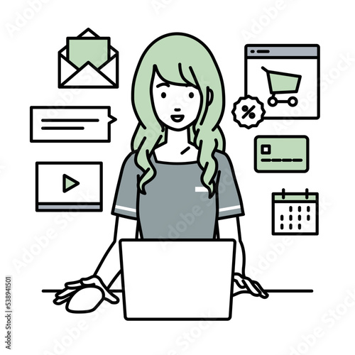 デスクで座ってPCでネットショップやマーケティングの仕事をしているエステ店員・受付・接客係の女性