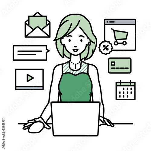 デスクで座ってPCでネットショップやマーケティングの仕事をしているドレスの女性