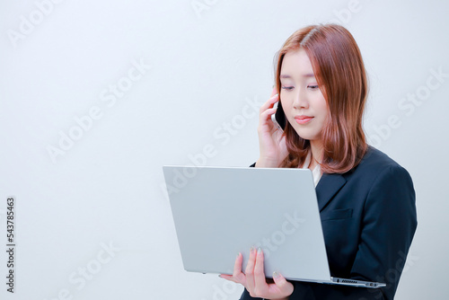 左手にPC右手にスマホのビジネスウーマン