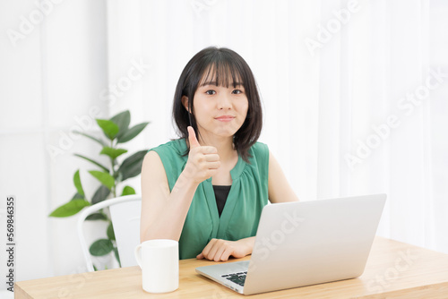 PCの前でいいねのポーズをする若い女性