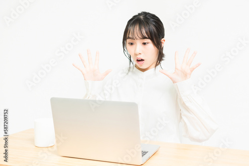 PCを使いながら驚いている若い女性