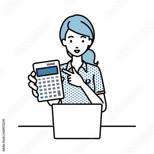 座ってデスクでノートPCを開いて電卓を指差してこちらに向けて見せているポロシャツの女性