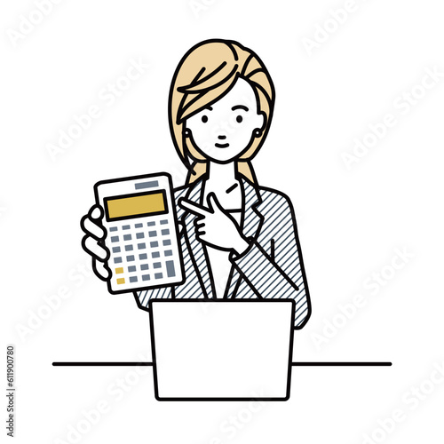座ってデスクでノートPCを開いて電卓を指差してこちらに向けて見せているスーツの女性