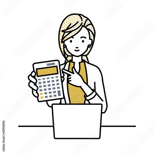 座ってデスクでノートPCを開いて電卓を指差してこちらに向けて見せているジャケットの女性