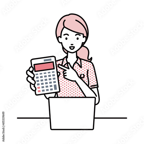 座ってデスクでノートPCを開いて電卓を指差してこちらに向けて見せているポロシャツの女性