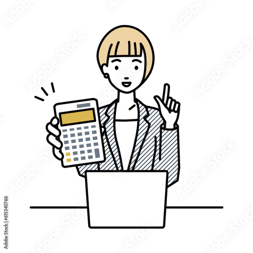 座ってデスクでノートPCを開いて電卓を持ってこちらに向けて見せているスーツの女性