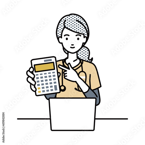 座ってデスクでノートPCを開いて電卓を指差してこちらに向けて見せている看護師の女性