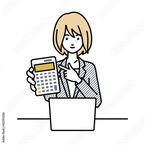 座ってデスクでノートPCを開いて電卓を指差してこちらに向けて見せているスーツの女性