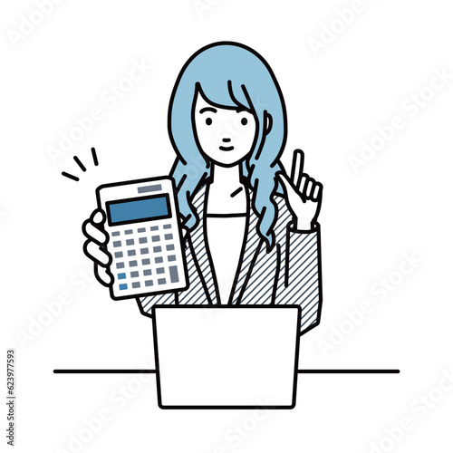 座ってデスクでノートPCを開いて電卓を持ってこちらに向けて見せているスーツの女性