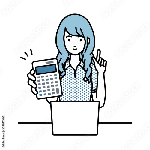 座ってデスクでノートPCを開いて電卓を持ってこちらに向けて見せているポロシャツの女性