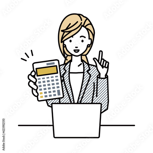 座ってデスクでノートPCを開いて電卓を持ってこちらに向けて見せているスーツの女性