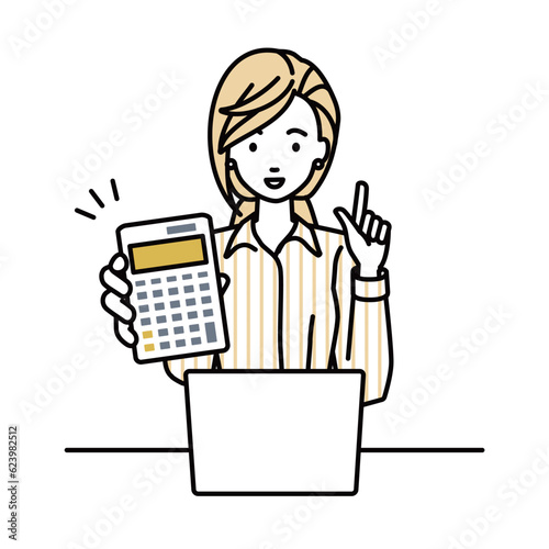 座ってデスクでノートPCを開いて電卓を持ってこちらに向けて見せているシャツの女性