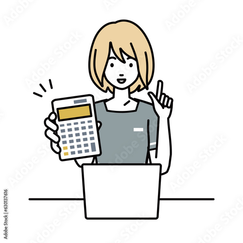 座ってデスクでノートPCを開いて電卓を持ってこちらに向けて見せているエステ店員・受付・接客係の女性