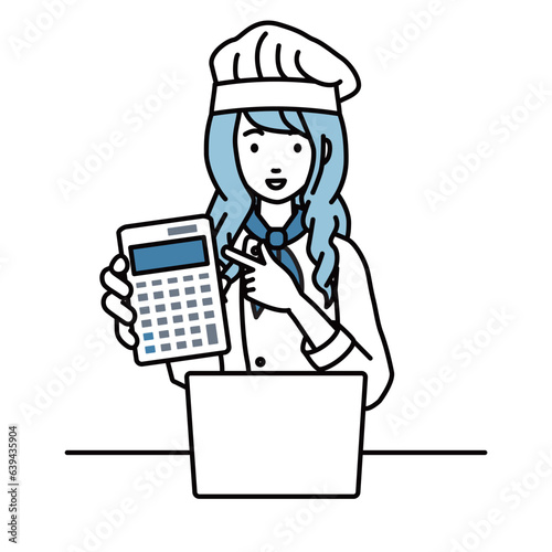 座ってデスクでノートPCを開いて電卓を指差してこちらに向けて見せている調理師の女性