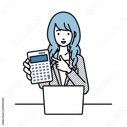 座ってデスクでノートPCを開いて電卓を指差してこちらに向けて見せているスーツの女性