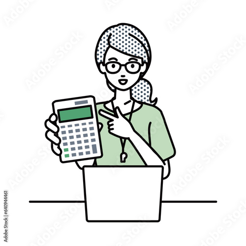 座ってデスクでノートPCを開いて電卓を指差してこちらに向けて見せている教師の女性