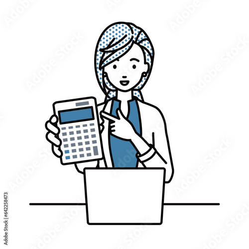 座ってデスクでノートPCを開いて電卓を指差してこちらに向けて見せているジャケットの女性