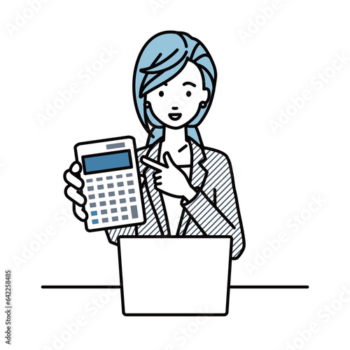 座ってデスクでノートPCを開いて電卓を指差してこちらに向けて見せているスーツの女性