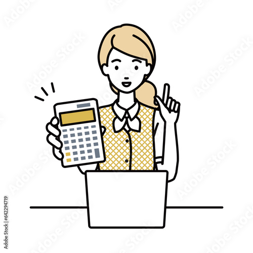 座ってデスクでノートPCを開いて電卓を持ってこちらに向けて見せている事務員制服の女性