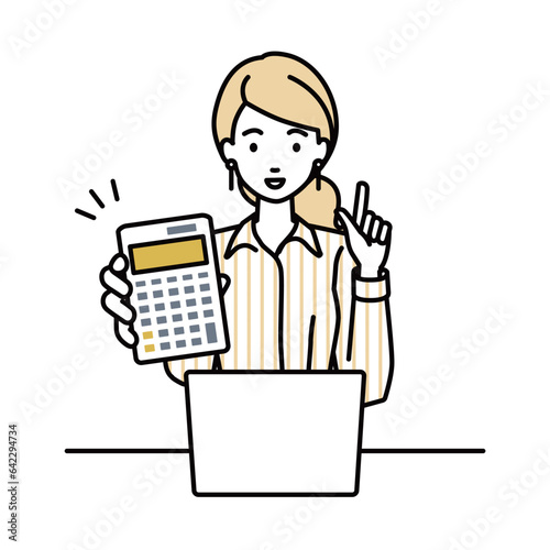座ってデスクでノートPCを開いて電卓を持ってこちらに向けて見せているシャツの女性