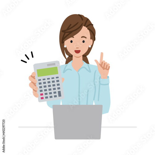 座ってデスクでノートPCを開いて電卓を持ってこちらに向けて見せているシャツの女性