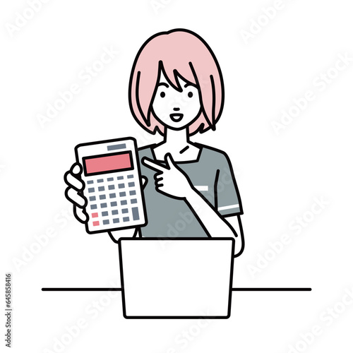 座ってデスクでノートPCを開いて電卓を指差してこちらに向けて見せているエステ店員・受付・接客係の女性