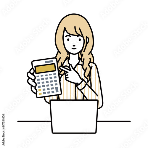 座ってデスクでノートPCを開いて電卓を指差してこちらに向けて見せているシャツの女性