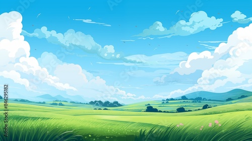 Peaceful Panorama of Rolling Hills and Open Meadows Under a Clear Blue Sky
