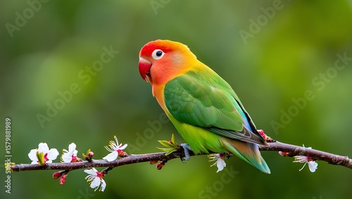 Peach faced lovebird perched on a flowering branch image