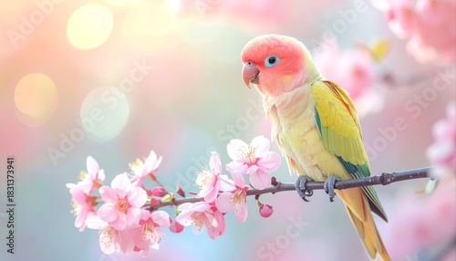 Peach-faced Lovebird Perched on Blossoming Cherry Branch in Soft Light