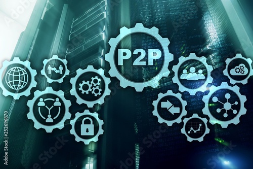 Peer to peer. P2P on the virtual screen with a server room background.