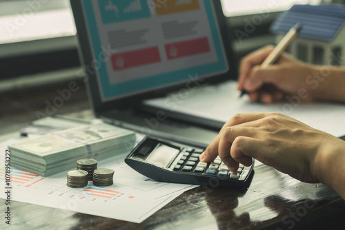 People are using computer to do online financial transactions such as debt, investment, calculation. Retro photo of economic downturn, stress.