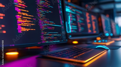 Performance-focused coding, virtual interface, futuristic coding lab, glowing accents