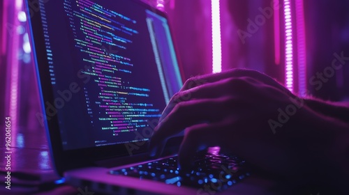 Person coding on a laptop with neon pink and purple lights reflecting on the screen, focused on programming tasks. Perfect for tech-related content