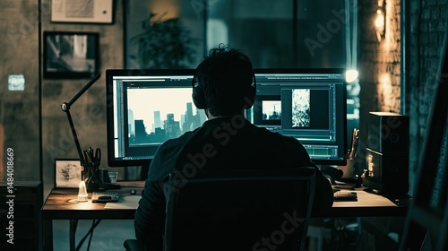 Person edits images, nighttime, dual monitors.