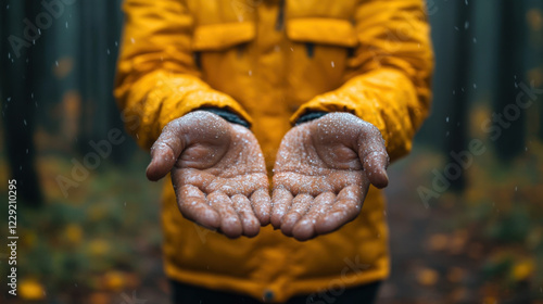 person in yellow jacket holds out their hands, catching raindrops in forest setting. scene conveys sense of connection with nature and tranquility