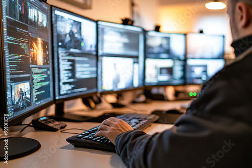 Person intensely working on a coding project, utilizing multiple computer monitors in a tech-heavy setup with sophisticated equipment.