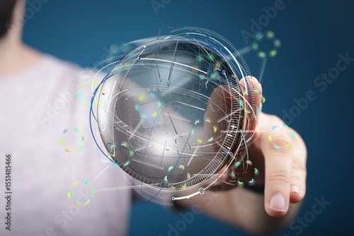 Person interacting with a digital globe, representing global connectivity and technological advancement.