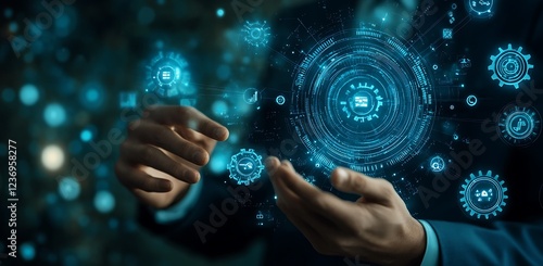 Person interacting with a futuristic digital interface displaying various data points and technological elements.