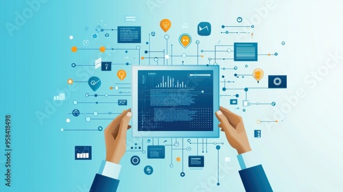 Person reading a contract, binary code replacing text, digital agreements and ethical challenges, flat design illustration