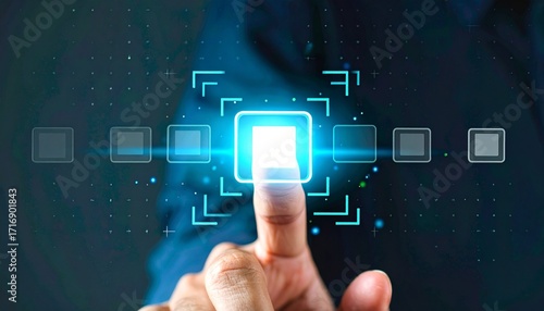 Person Touching Futuristic Interface Glowing Blue Square Digital Technology