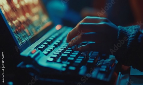 Person types on laptop with blue light glow.